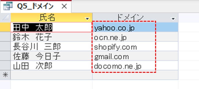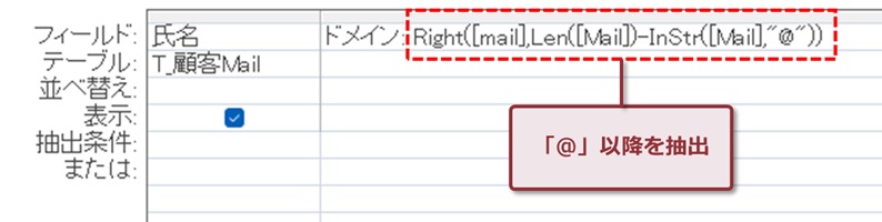 - ドメイン: Right([mail],Len([Mail])-InStr([Mail],"@"))