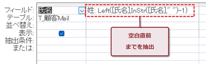- 姓: Left([氏名],InStr([氏名]," ")-1)
