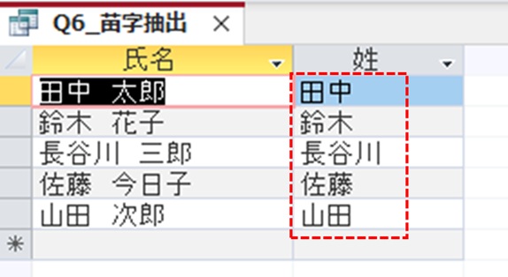 Accessの文字列操作関数で、フルネームから姓(苗字)や名を抜き出すことも可能です。