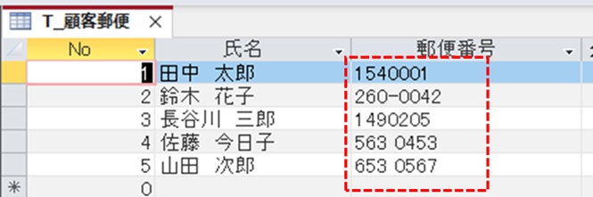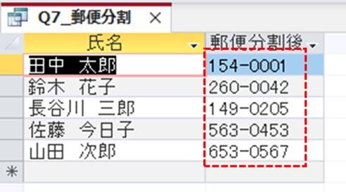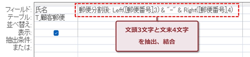 - 郵便分割後: Left([郵便番号],3) & "-" & Right([郵便番号],4)