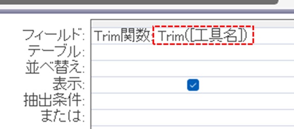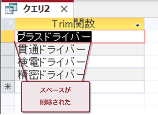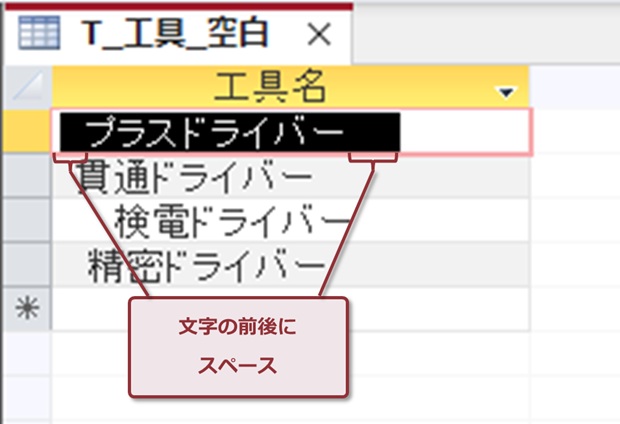 テーブル「T_工具_空白」に4件のデータには、いずれも文字の前後にスペースが含まれています。