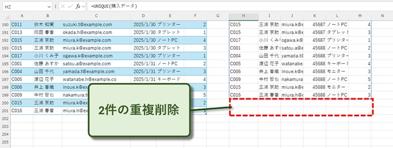 重複していないデータの最初の行のみが残り、2つ目以降のデータが削除されます。