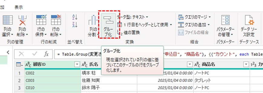 パワークエリには「重複削除」だけでなく、「グループ化」という似た機能があります。