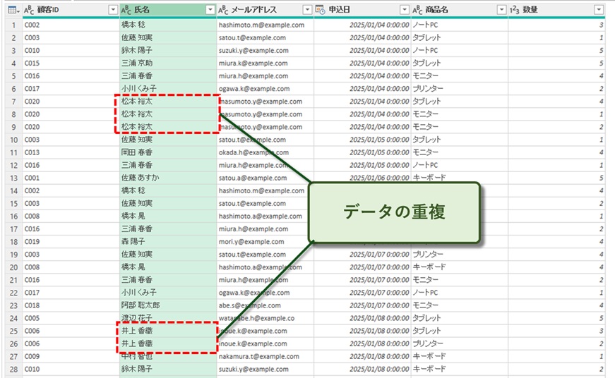 例えば、「氏名」だけでなく「申込日」や「商品名」など、複数の列の組み合わせで重複を判断したい場合、パワークエリの重複削除はとても便利です。